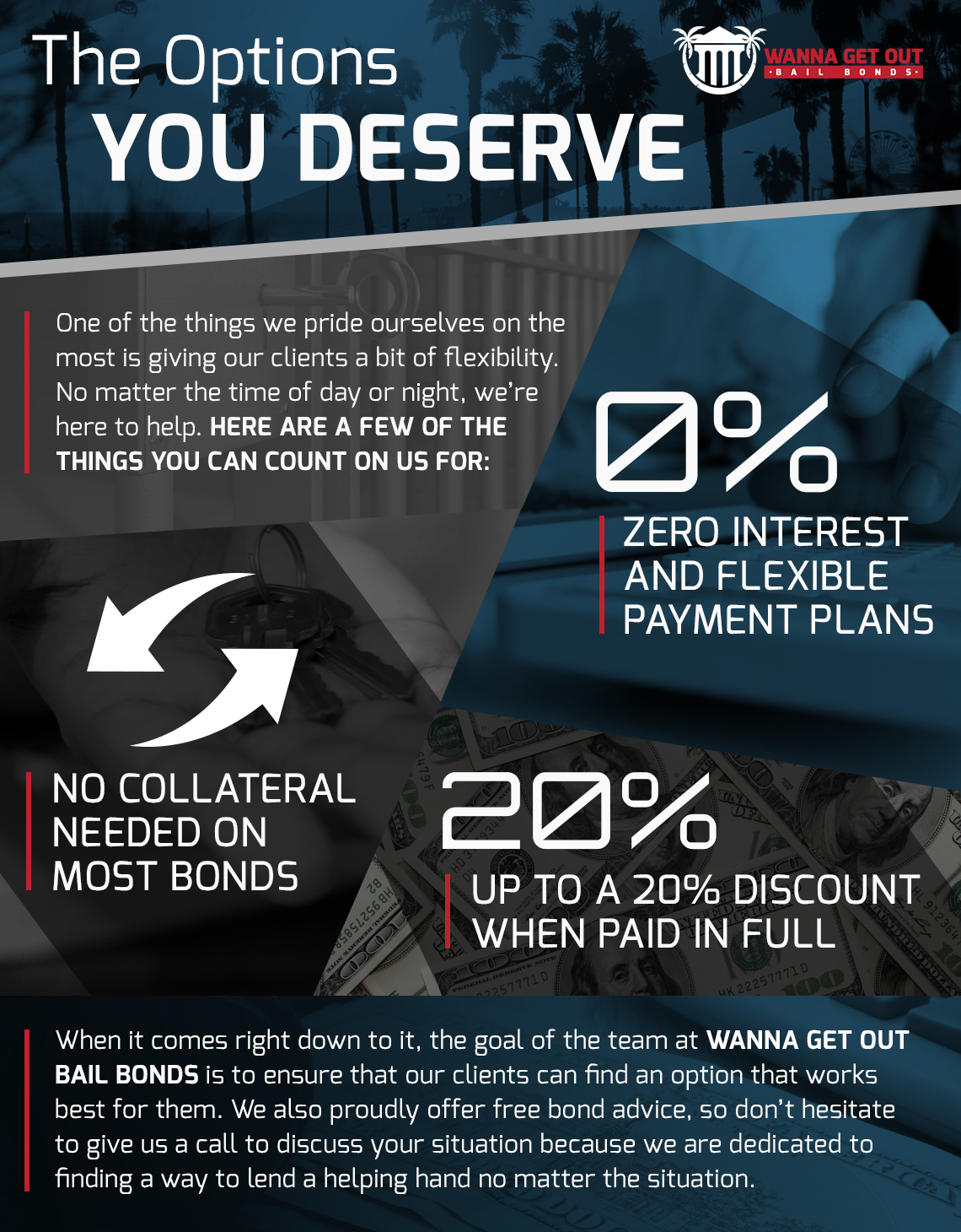 Here’s a bit of truth: you have options when it comes to which bail bond company to choose. While some in our industry might see this as a bad thing because it leads to competition, we see it as an opportunity to rise to the top. In other words, we know that our reputation for being the best in the business is what causes people to choose the team at Wanna Get Out Bail Bonds.