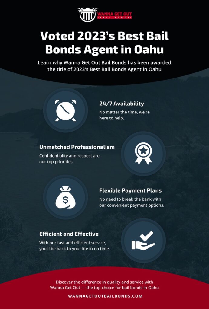 At Wanna Get Out Bail Bonds, we are proud to announce that we have been awarded the prestigious title of 2023’s Best Bail Bonds Agent in Oahu. This recognition is a testament to our dedication and commitment to providing exceptional service to our clients. We strive to make the bail process as stress-free as possible for our clients and are honored to be recognized as the best in the business.